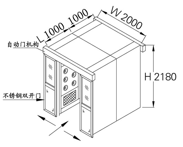 2.6照明燈點(diǎn)亮后,設(shè)定時(shí)間內(nèi)沒有被再次觸發(fā),則自動(dòng)熄滅。普通貨淋室|雙開門貨淋室產(chǎn)品配置: